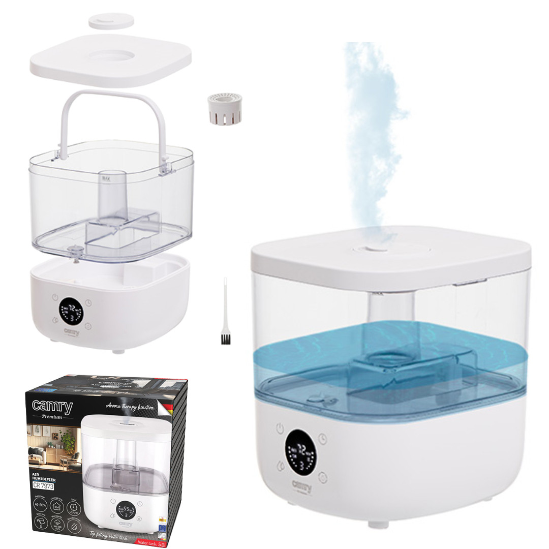 Ультразвуковий зволожувач повітря Camry CR 7973w — це не тільки пристрій, що покращує якість повітря у вашому домі, але й елегантне доповнення інтер'єру. Завдяки сучасному дизайну він прекрасно впишеться в будь-яку кімнату. Завдяки цьому ви зможете насолоджуватися здоровим і комфортним встановленням незалежно від пори року. Дізнайтеся, як Camry CR 7973w може зробити ваш інтер'єр приємнішим і розслаблювальним.