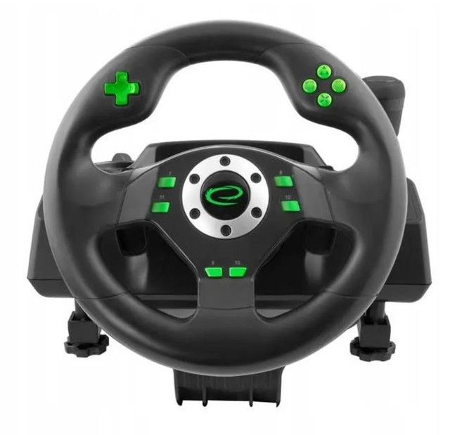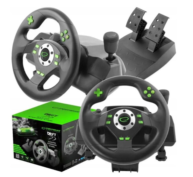 Ігрове кермо Esperanza EGW101 Drift стане чудовим доповненням для любителів автосимуляторів. Пристрій сумісний із ПК та PlayStation 3, оснащений педалями газу та гальма, важелем перемикання передач і вібраційним зворотним зв’язком, що створює реалістичний досвід керування. Кут повороту керма становить 270°, що дозволяє точніше контролювати автомобіль у грі.